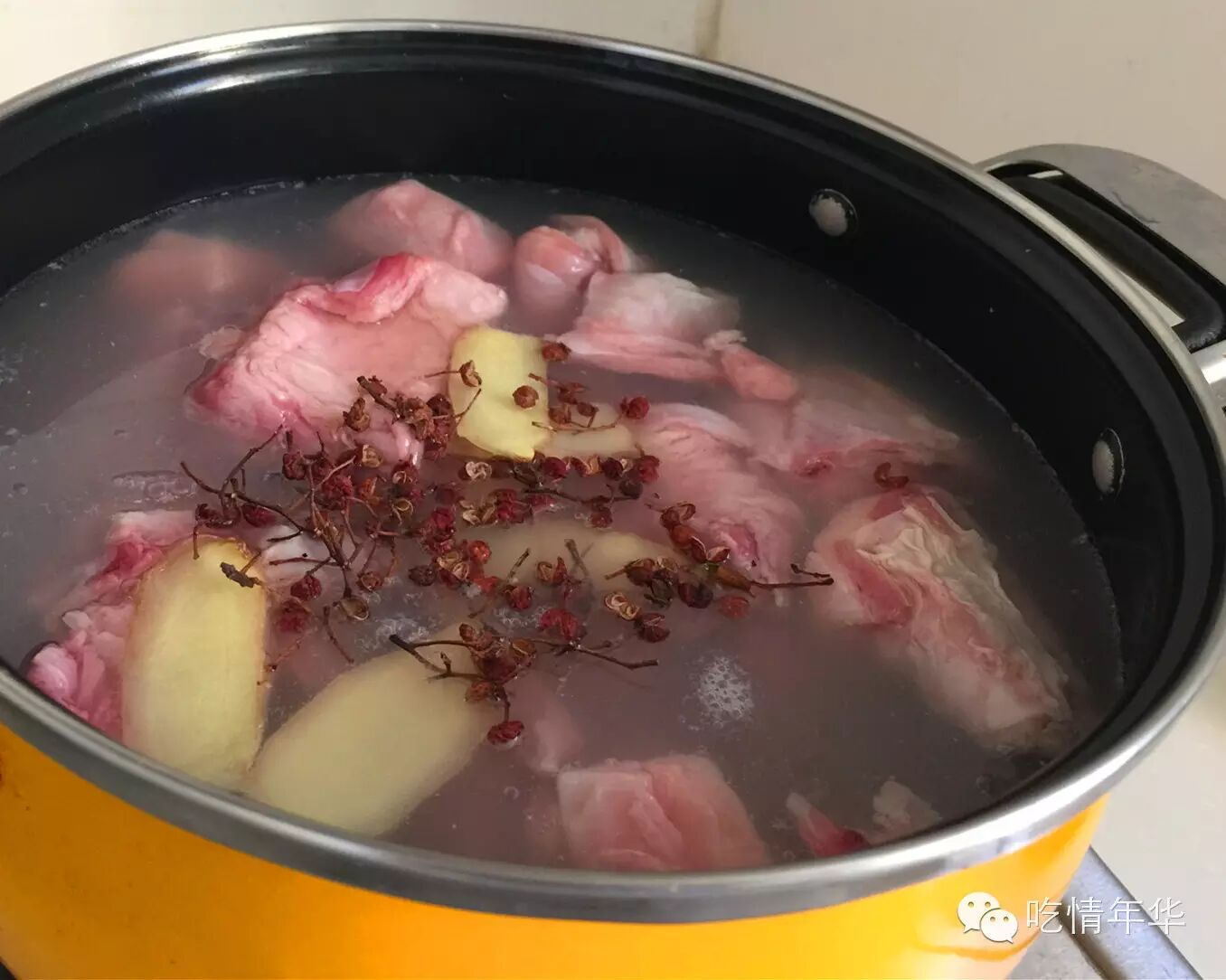 1、将肉凉水下锅,待水烧开,撇去浮沫,加入调料炖煮。