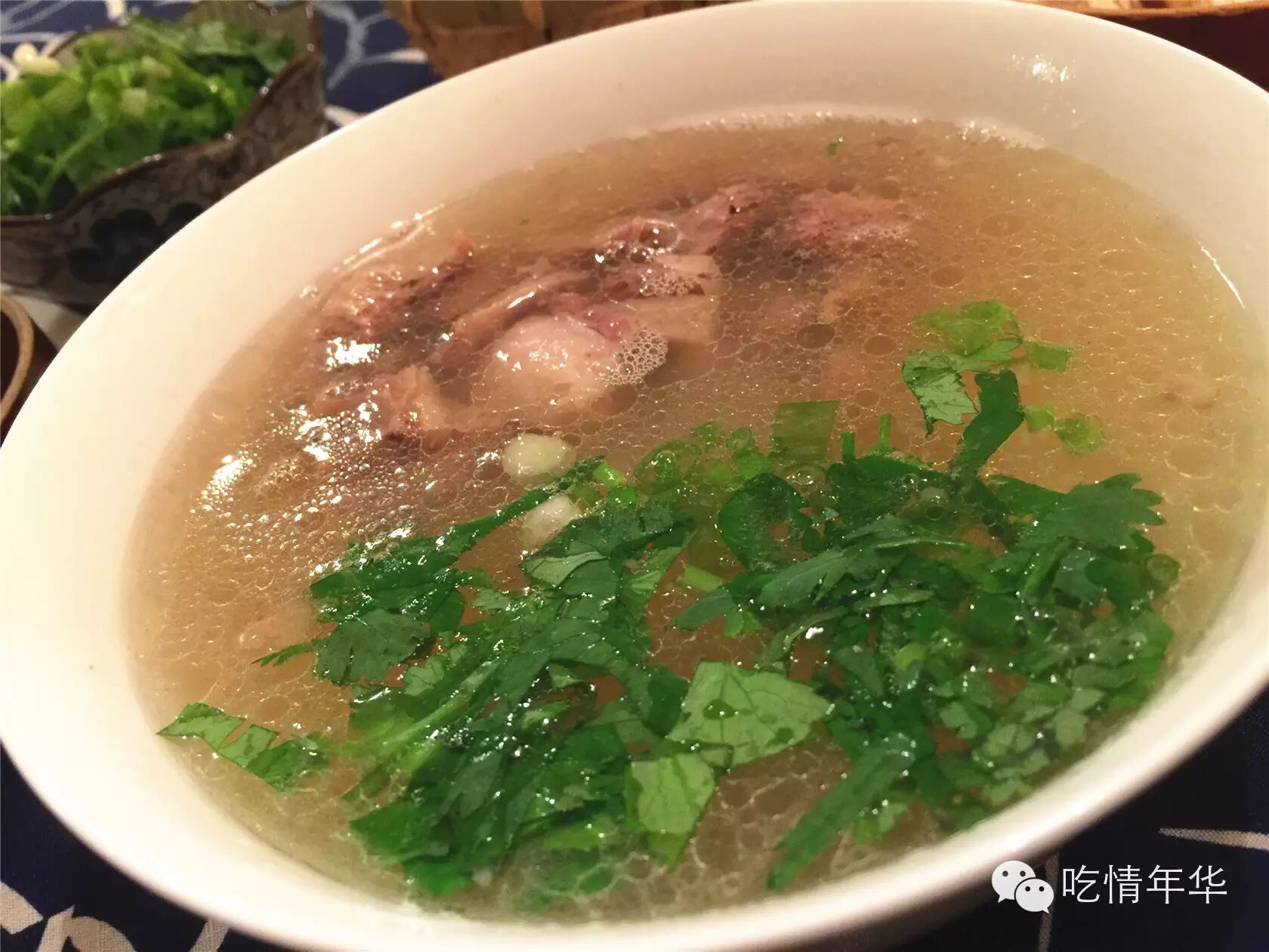 6、将粉丝和肉汤一起盛出,加入切好的羊肉,撒上葱花和香菜,嗯~~~~好香!
