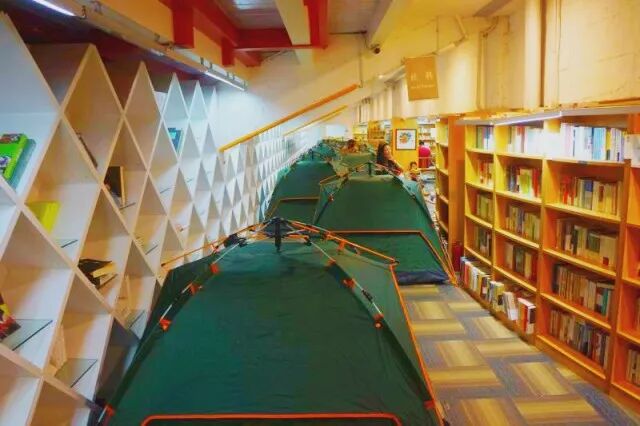 和白天人来人往的书店不同,晚上的书店多了一层静谧感,小家伙们拿出帐篷、搭建帐篷亲自解决今晚的住宿问题。