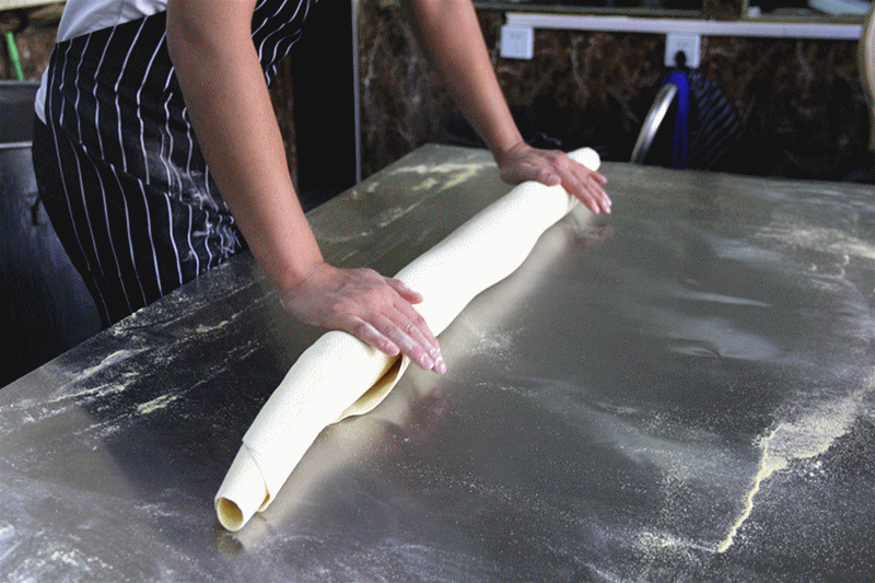 将擀好的面铺到案板上,擀面师傅开始切面,这也是极考验功力的一环。只见师傅用刀,行云流水一气呵成,丝毫没有迟疑和停顿,面条粗细均称,当真是细若韭叶,薄如纸。