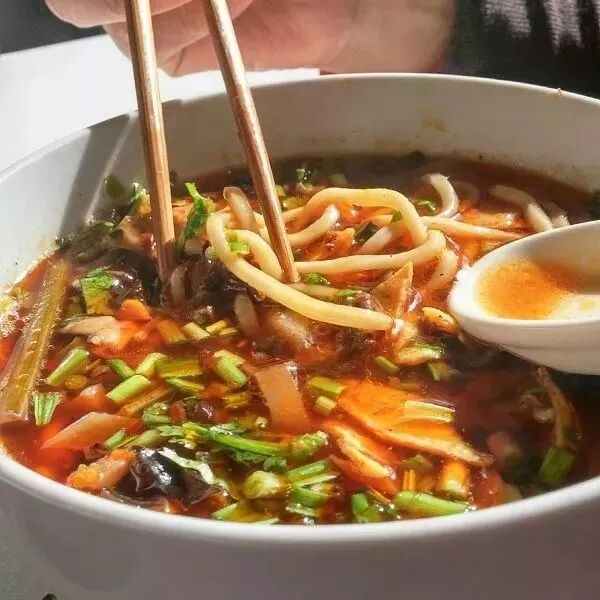 这样擀出来的面条,煮熟之后面身通透如玉,口感筋道爽滑,入口绵软却有嚼劲儿,才算得上是一碗好面。臊子汤是臊子面的灵魂。只有一碗热得烫嘴的酸辣汤底,才能撑得起一碗完美的臊子面。红油浮在最上层,切成碎丁的萝卜、土豆、豆腐、以及调味的香菜、木耳经过油锅的翻滚和牛骨底汤的浸润,香味格外诱人。