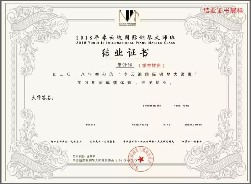 • 学员结业后颁发由国际钢琴巨星李云迪等全部大师签名的结业证书