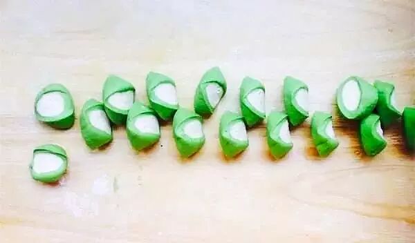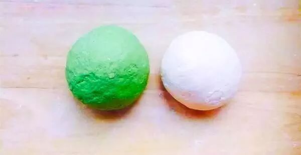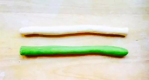 3.用擀面杖擀开绿色的面团,包裹白色面团;