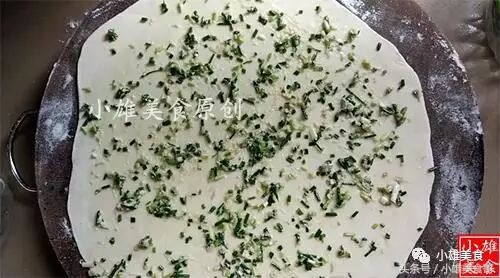 5、醒好的面团,擀成圆薄饼,如图所示,然后把做好的酥油均匀的抹在上面。