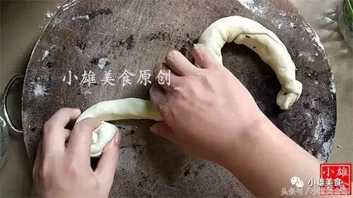 卷好的面条,我们用手捏一下,把它稍微扯长一点。