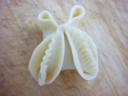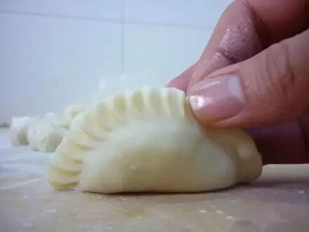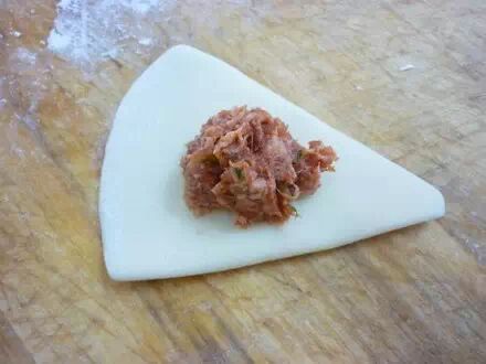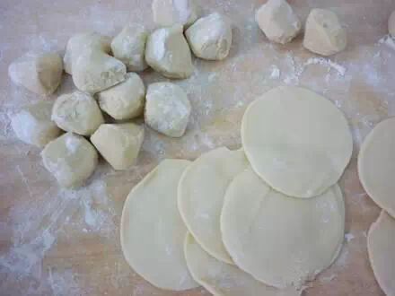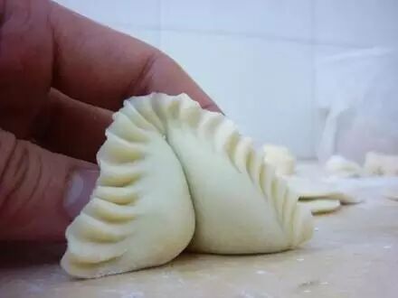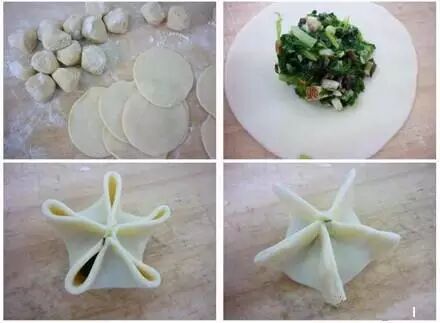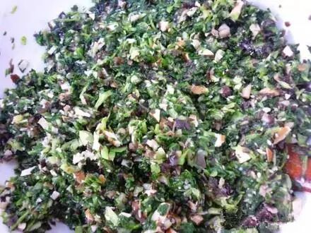 馅心:芹菜250、肉末150、盐、味 精、鸡精、胡椒粉、料酒