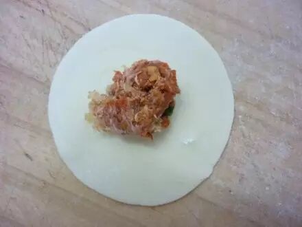 制作方法:面粉加入开水烫成面团,揉光搓条下剂子,擀成圆皮