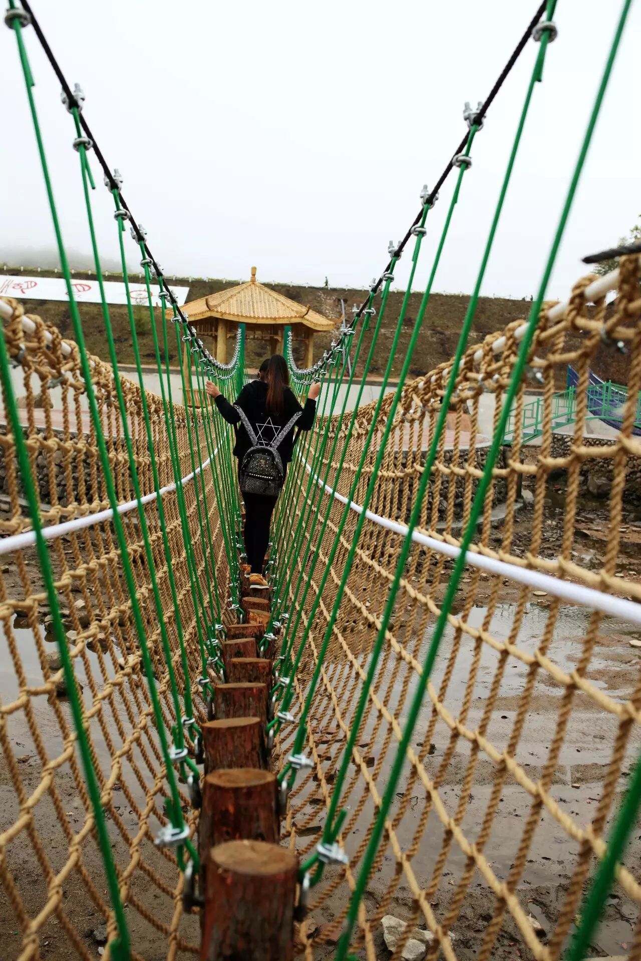 云中漫步空中缆索,长度170米,离地面高度68米,被称为龙江第一吊桥。站在吊桥上,大峡谷的鬼斧神工饱览无遗。然而一望脚下深谷,让人不免倒吸一口。因为天气的原因,当日景区的雾气比较重,这让“云中漫步空中吊桥”更加有了属于自己的味道,整个吊桥“隐藏”在雾中,走在上面真的有“漫步云端”的感觉。