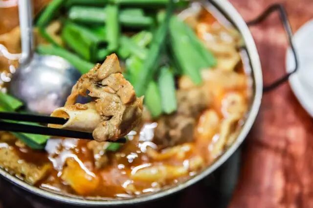 不用看菜单,只说要大份还是小份,要加什么配菜。最小份的羊杂锅端上来,份量也让人满意。大块的羊肉铺满整锅,「新鲜的葱点缀在上面,红油白汤,食欲一下子被勾起。」