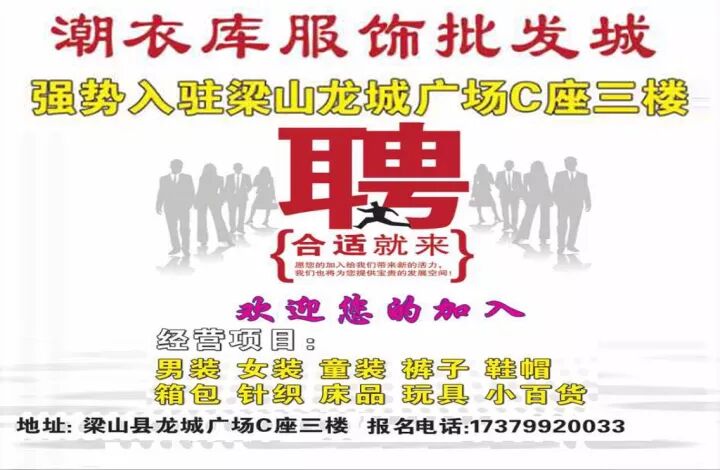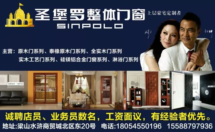 【招聘】梁山圣保罗门业 招聘店长、客户经理、导购数名,工资面议。电话:18054550196 丁经理 地址:梁山水浒商贸城。