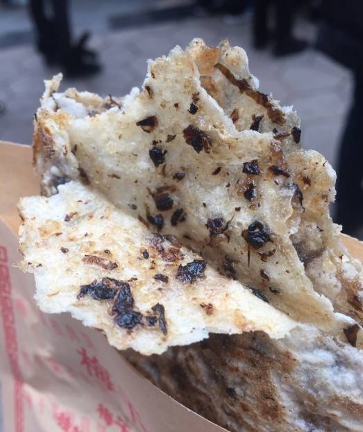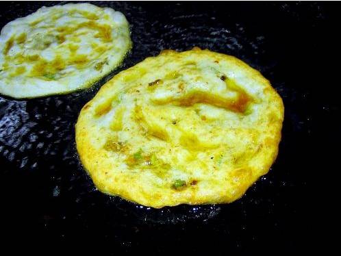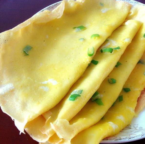 摊的鸡蛋饼也是美味,或是加葱花,或是加韭菜,一勺蛋液下去,裹挟着葱花的辛辣,中和了鸡蛋的腥气,出锅之后一定要趁热吃~