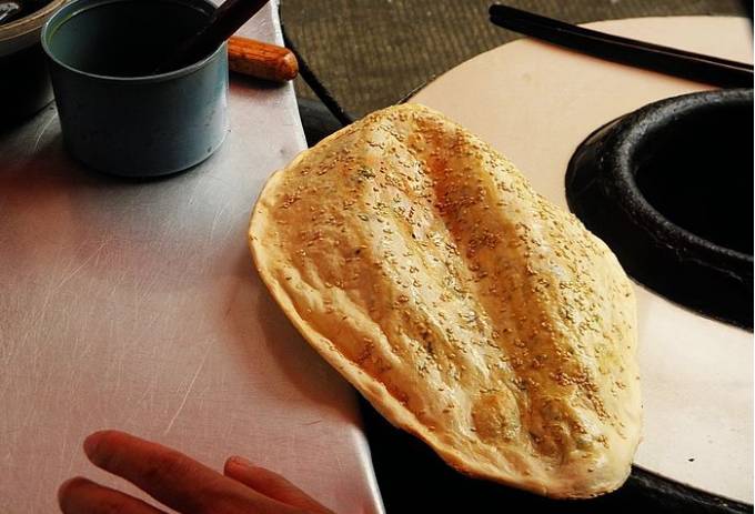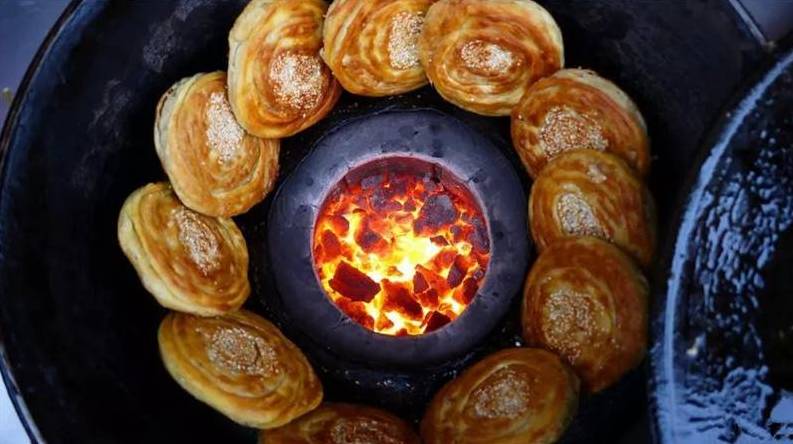 醒好的面团三下两下,抻宽拉长,有时成海棠叶状,有时成鞋底样,最后再撒上芝麻,多几下少几下,都可随意。这一切在三两分钟完成,将面食迅速贴进了炉膛里,不过两三分钟,用一把专用钳子,轻轻将体积增大近一倍的锅盔取出来,直接递给站在一旁的食客手上。