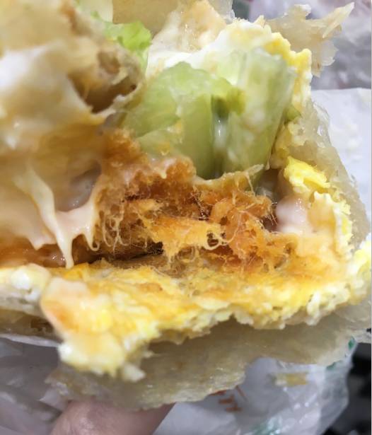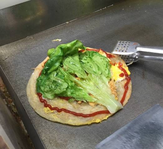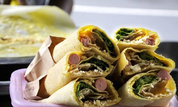 新鲜出炉后的手抓饼,千层百叠,面皮如薄纸,裹好之后用手抓起来,面丝千连,外表金黄酥脆,内层柔软白嫩,香味扑鼻而来,里面层层叠叠的肉松火腿鸡蛋生菜,有肉有素,还有番茄酱、沙拉酱、千岛酱......让每个人来不及等待,抓起就吃。