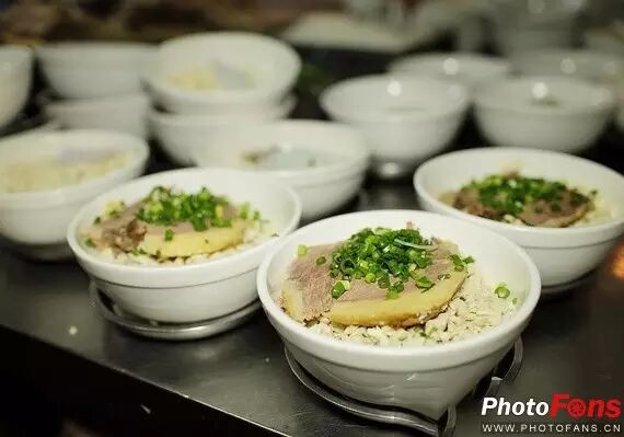 加牛羊肉、粉丝、葱花、蒜苗、香菜,高级一点的(西安都称之为“优质的”)还有木耳、黄花菜和香干等配料。放到灶台旁边等待师傅加汤煮沸。这样一大碗自己亲手掰好的泡馍,翠绿的葱花、蒜苗、香菜、红褐色的牛羊肉、黄色的金针菜、映衬着洁白晶莹的粉丝、黝黑的木耳、香味四溢,使人食指大动。