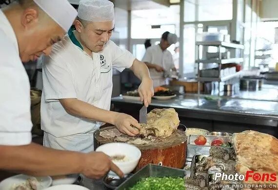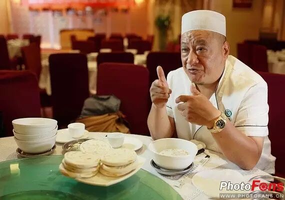 同盛祥第四代传承人乌平师傅。乌师傅讲述羊肉泡馍的历史和制作。一碗好的泡馍,首先须先有一锅煮制成的好汤,好汤的制法当然是商业秘密。而煮肉工艺也特别讲究,先要将牛羊肉反复漂洗,浸泡约5小时,切成约5斤重的大块,再把牛羊肉入锅,下旧调料袋提味儿,大火煮约4小时,肉块入锅,换新调料袋,加盖压实,旺火烧开后煮2至3小时改用文火炖约6小时,待汤浓肉烂,出锅上板备用。
