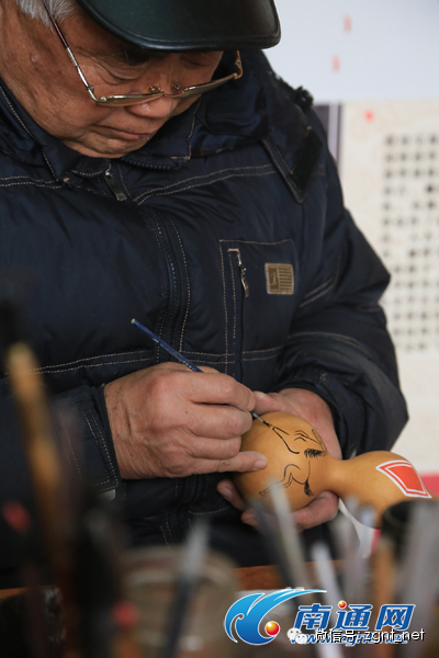 冬日午后,南通非遗工坊5号楼窗户前,77岁的陈宝龙正在忙碌。乘着中午太阳好、暖和,陈宝龙拿出一块剪好的砂皮纸,给葫芦上上下下、仔仔细细打磨了一遍。葫芦顿时变得光滑、更有光泽。插上电源,打开开关,以电烙铁当笔,在葫芦上来回勾勒,一只栩栩如生的羊便出现在眼前。电烙铁再次挥舞,“一生平安”4个字烙在了葫芦的另一侧。