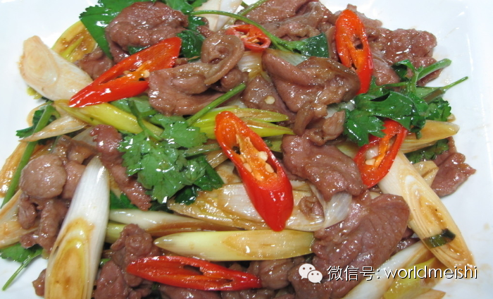 2)旺火热油,下入羊肉,炒至变色,加入葱白,爆出香味后,加生抽(用生抽来控制咸淡),迅速翻炒后出锅。