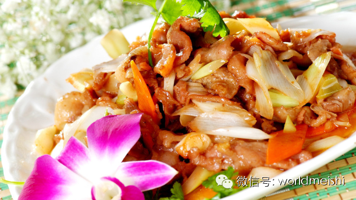 (2) 锅中放油,烧至五成热时,逐片下挂浆的肉片,捞出,待油温升至五成热时再放入肉片,如此反复三次使肉片外焦里嫩。