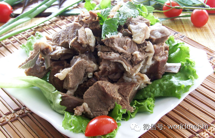 步骤:1)将羊肉连骨分解成5-7厘米的大块放入凉水锅中煮开后撇去浮沫继续煮约2小时肉,烂不脱骨为原则捞出盛入盘中。