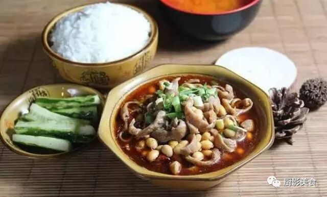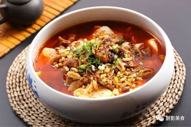 大邑是四川的一个县城,肥肠血旺是当地的特色吃法。大邑以恶霸地主刘文彩而出名,现在大邑以美食“肥肠血旺”而享誉川西。这个菜充分体现了川菜大油旺火的特色,软糯的肥肠与嫩滑的血旺块浸润在豆瓣酱、辣椒面、鲜辣椒等多种香辣调料汇聚的红色汤汁中,炸酥的黄豆和碧绿的葱花与香菜碎在表面点缀着……一块血旺、一根肥肠,加上一点豌豆、香菜、葱花,混合着麻辣的汤汁,入口先是麻辣味直窜而来,接着鲜嫩血旺入口即化,最后耙和的肥肠嚼劲十足,吃起来香辣滚烫,相当下饭!