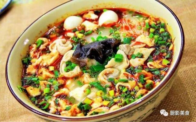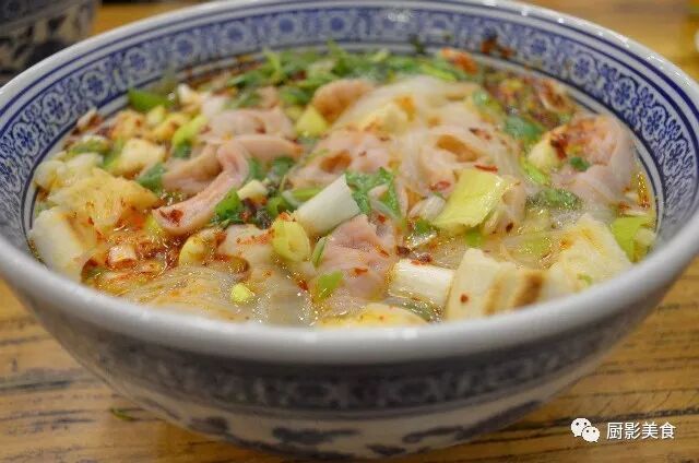 肥肠粉是四川省成都市众多地方传统名小吃中最有特色的品种之一,记得高圆圆在《好雨时节》里就特别爱吃肠粉,特别是看到那一碗,红油浮面,芽菜葱花零星,嘴里就开始不由自主的冒口水了!正宗的肥肠粉选用的是上等红薯粉、菜子油及干红辣椒、花椒等原料,锅汤则是用肥肠、猪骨头等以及多种佐料熬制而成。红油飘香,霉干菜、榨菜末星星点点,炒黄豆焦黄浑圆,粉软滑烫,汤鲜味浓,夹起颤巍巍的肥肠送入口中,只觉卤香细腻,滑爽耐嚼。