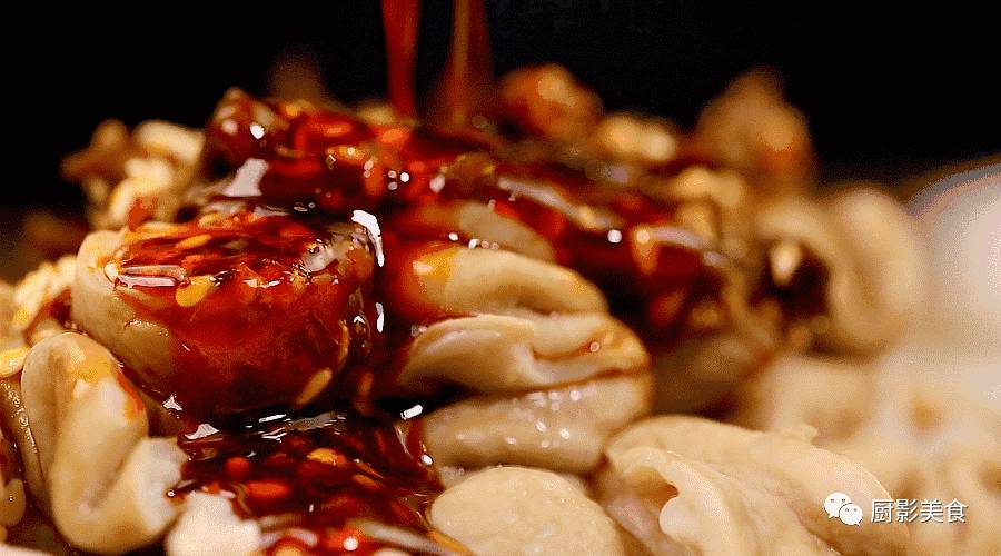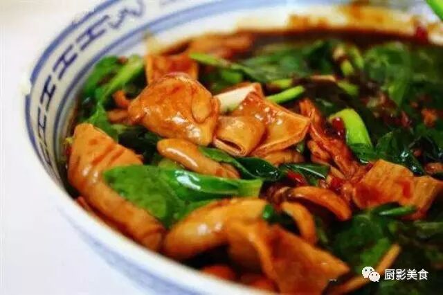 温拌肥肠,喜欢的人简直视若珍宝。肠头口感最为爽嫩、厚实、有嚼头,地道的店家都是整条翻转洗净后,待烧制完毕,上桌前才切段调味,这样美味就牢牢封住,等到上桌前才绽放。肠肥味重,放足了红油辣椒浸着就更浓,配上鲜嫩水芹,鲜辣清香让舌头一时之间都找不着北。肥肠内有猪油附着,所以这道菜一定是温拌而不是凉拌。