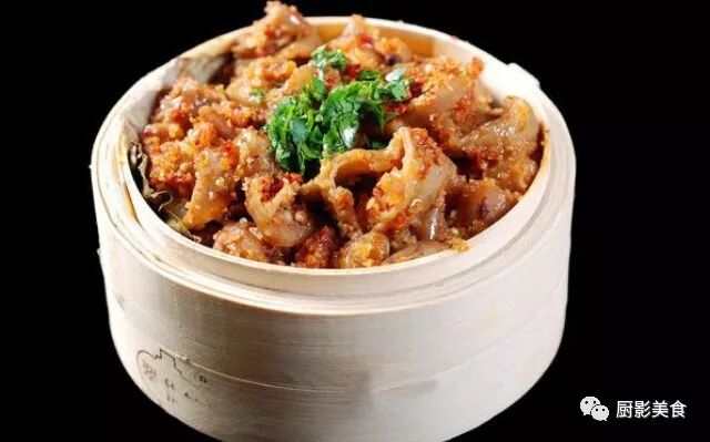 粉蒸菜式是四川人家餐桌上不可缺的一碗,四川的粉蒸风味独特,鲜辣带麻,与别处总是不同的。譬如这粉蒸肥肠,将糯米加调味料舂碎,包裹于肥肠之上,之后再一齐蒸熟,在高温高压的环境下,米粉吸收了肥肠的油脂,而肥肠则吸收调味,特别软糯。更多精彩内容请关注微信公众号:厨影美食。以红薯打底,肥肠、红薯相互吸收各自的香味,几种食材的差异性使口感层次特别丰富。
