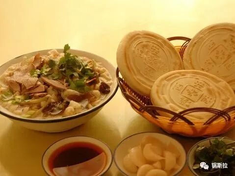牛羊肉泡馍,用优质牛羊肉加佐料入锅煮烂,汤汁备用。把烙好的“虎背菊花心”——坨坨馍,掰成碎块,加辅料煮制而成。
