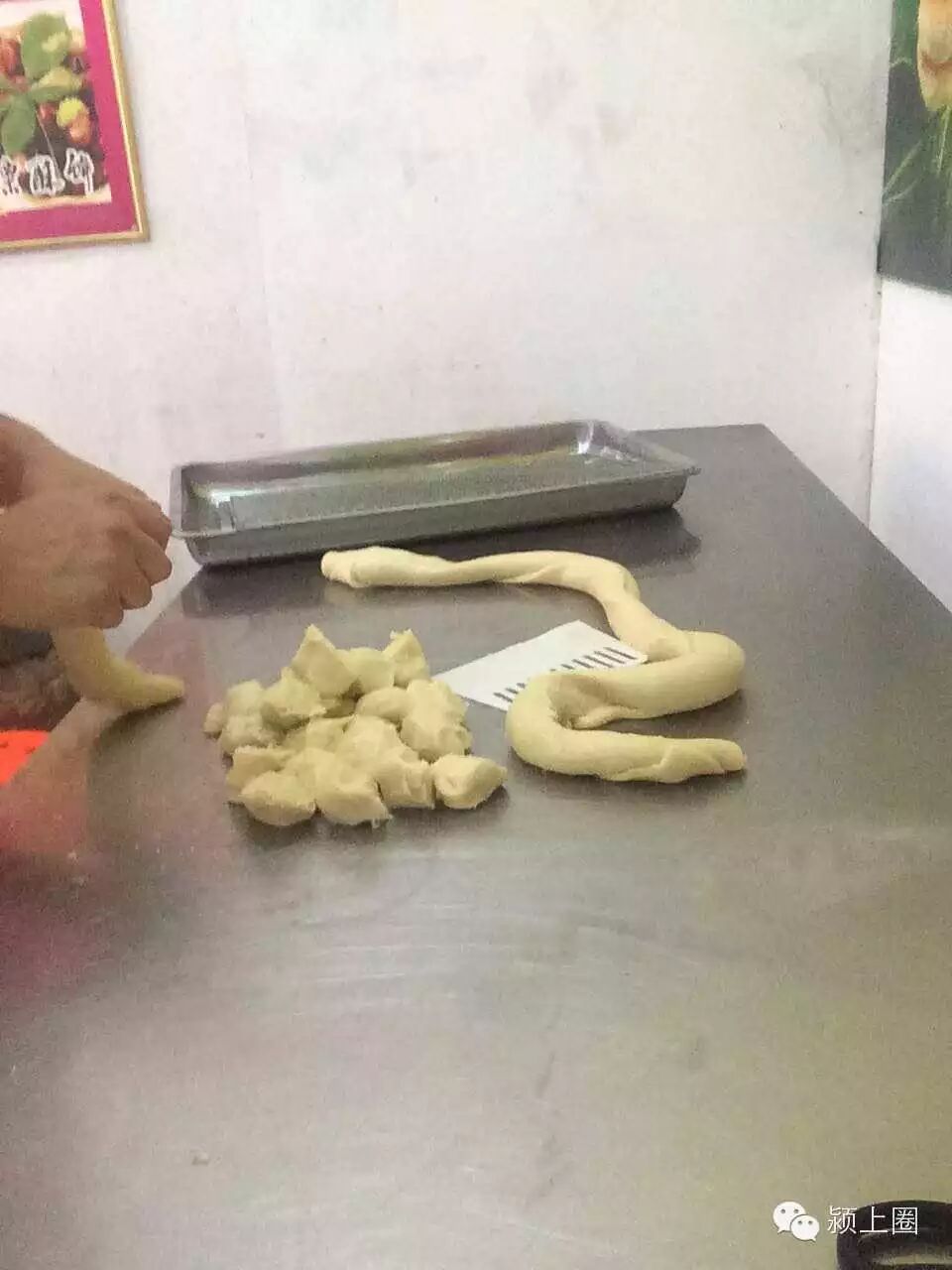面心和面皮和好了 , 把它们按照比例包在一起(也是也科学配比的),分好面剂子,大小是有严格规定的,新手做还真不好把握。做好后,就可以包入香甜诱人的板栗陷了 (板栗馅是店主秘密配制的)