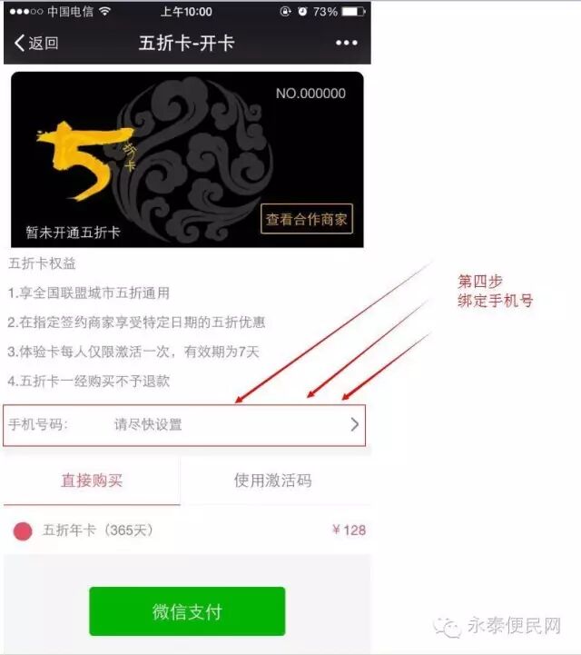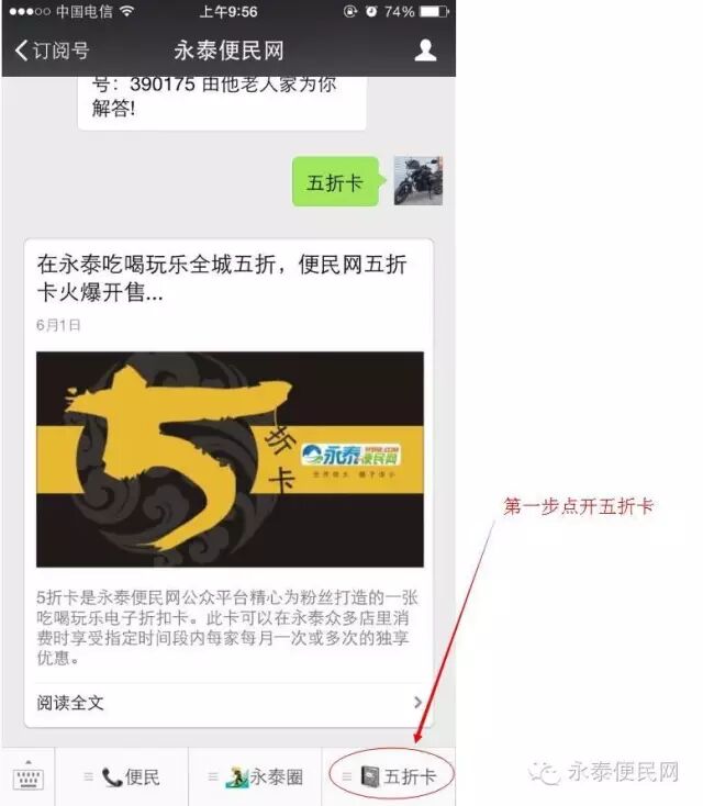 1、打开【永泰便民网】公众号,点击下方五折卡。