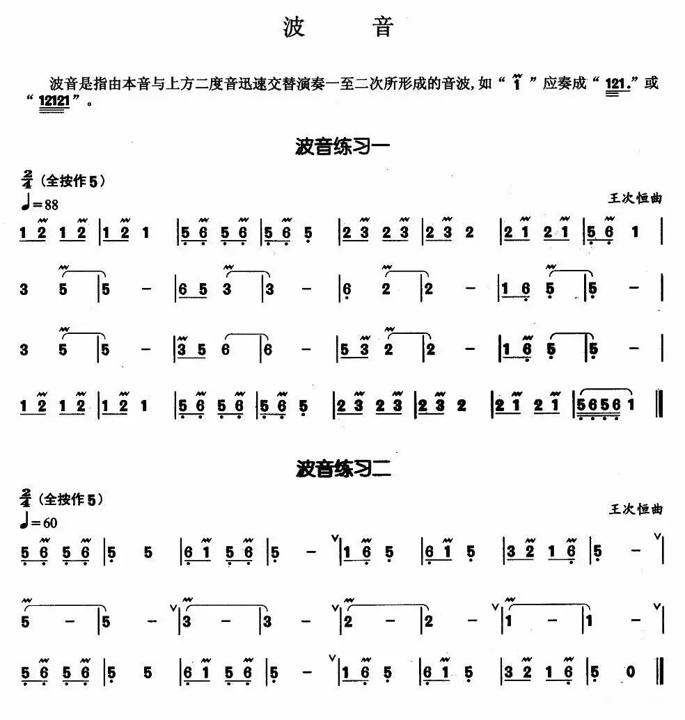 波音----是由本音与上方二度音迅速地交替演奏1-2次形成的一种音波。波音虽然可以稍微吹的明显一些,但决不能吹的很强、很生硬,不能使音波比本音还强还突出。手指要快放轻落,手指的动作应该一致,除了本音外,其他各音忌用吐奏。波音的速度同样可快可慢,要根据乐曲的速度及音符的时值的长短再决定!![]()