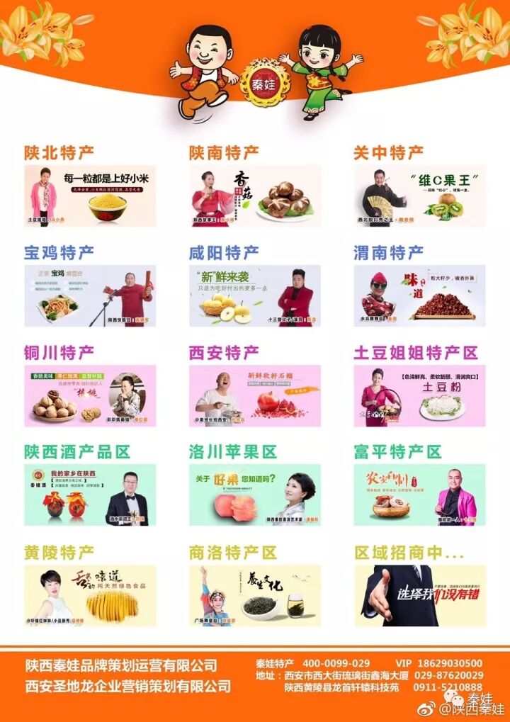 三、秦娃商城股权分享十三名有代表陕西特产文化的产品拥有人,目前有“秦歌第一人”十三狼(轩辕红苹果)、“@陕西秦娃”寇万龙(秦娃酒)、“土豆姐姐”冯小燕(陕北土豆系列)、“陕西凉皮女王”贾亚芳(凉皮、猪蹄),还需九名参与秦娃股权,你有代表性产品以及供量企业,就请快速联系;