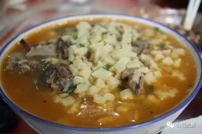 山阳羊肉泡是陕西省商洛市山阳县的特色小吃。山阳羊肉泡在煮馍过程中加入了羊油熬成的辣油,辣味与羊肉的鲜香浑然天成,形成了浓郁的百分百山阳味道。