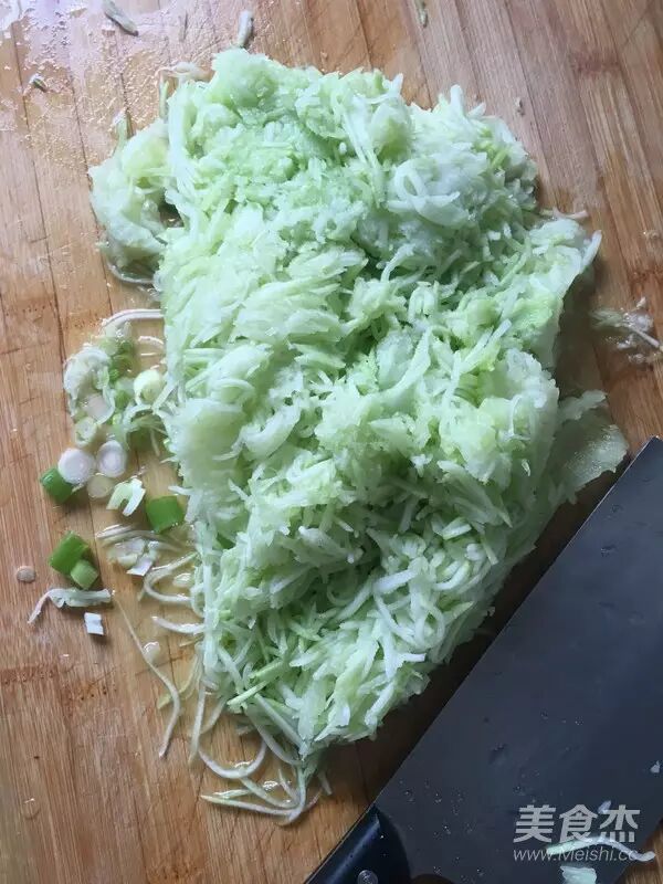 西葫芦洗净去皮擦成细丝,葱去皮洗净切成葱花,一起剁碎