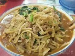 同样还是华阴岳庙西路胖女人肉夹馍旁边的孟记大刀面,也是到华阴必选美食之一,大刀面和陕西很多地方大刀铡面的做法一样,面用杠子压薄,大刀铡细,传统吃法有汤有干,臊子却只有豆腐、粉条,簿筋光的面,拌上油泼辣子,来瓣蒜,就是最舒服的家常美食,实惠,美味