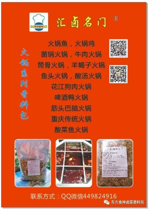 ◆火锅类:火锅鱼,火锅鸡,菌锅火锅,牛肉火锅,筒骨火锅,羊蝎子火锅,鱼头火锅,花江狗肉火锅,啤酒鸭火锅,酸汤火锅,筋头巴脑火锅,重庆传统火锅,酸菜鱼火锅;等等各种香料包。