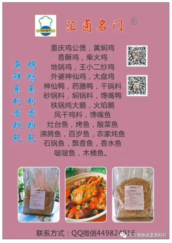 【介绍】购买汇卤名门香料包产品,提供技术支持,3包起免邮费;所有料包附带详细技术资料。 产品配以多种上等中草药材,天然、营养、健康,区别于普通香辛料,打磨成粉末状的产品;按照严格比例研发配制而成。本产品2010年至今,已取得众多客户信任,拥有忠实的客户粉丝;为客户带来真实的利润空间,满意的技术交流;为客户解决开店技术问题,为厨师解决新菜研发问题,为家庭主妇提供方便的配料包。