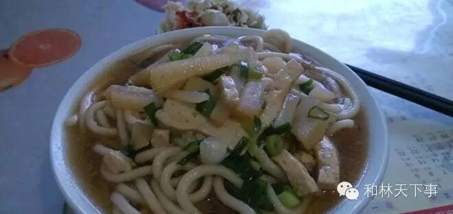 吃时配一点小菜,比如咸韭菜、辣萝卜干等。此时和林正宗的一碗饸烙面就完成了。