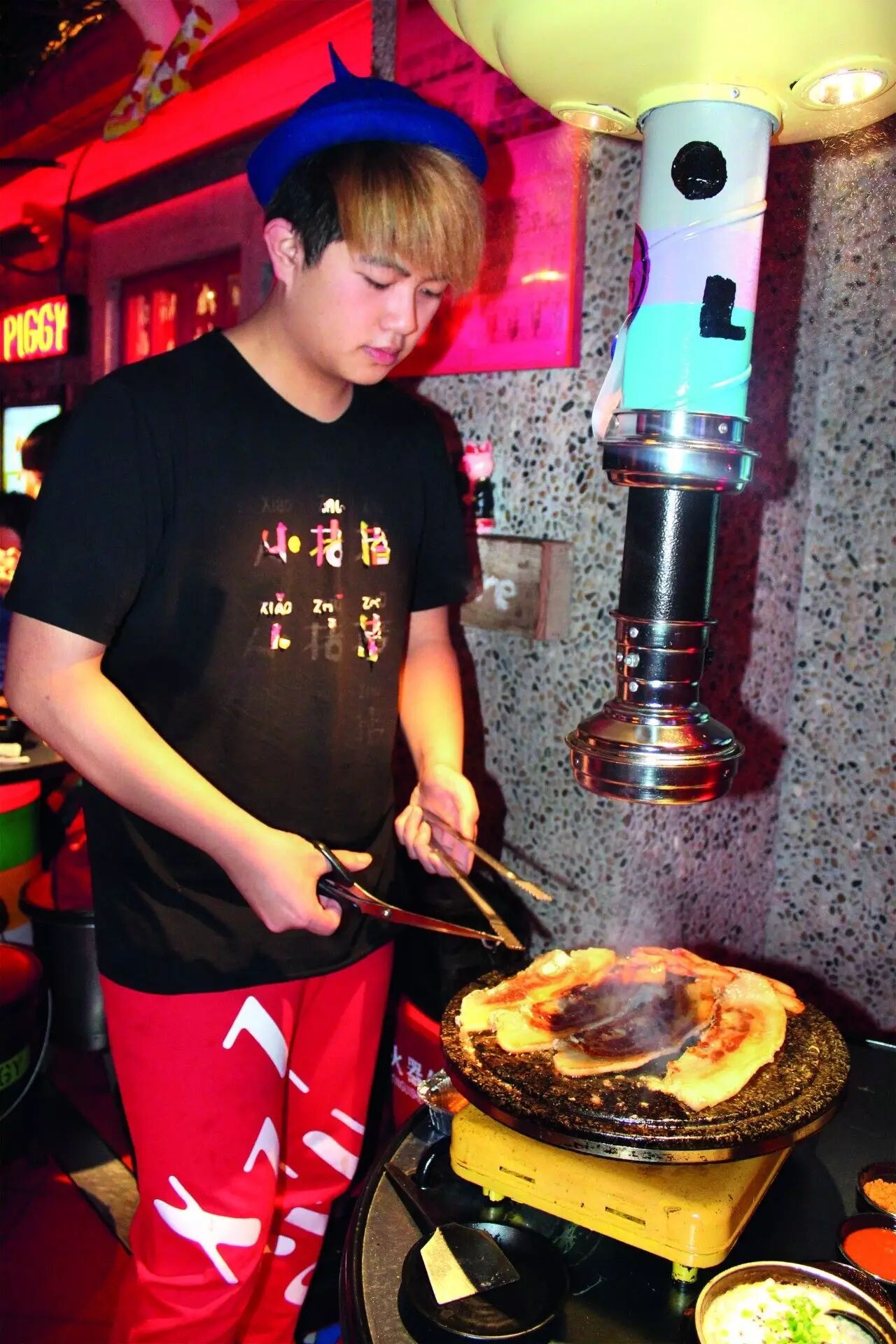 “小猪猪”定位精准,专做年轻人,尤其是年轻女孩的生意。为了吸引她们进门,小猪猪拿出两大杀手锏:萌猪+帅哥。装修萌萌哒,轻松有趣;帅哥来烤肉,体验式消费更愉悦。