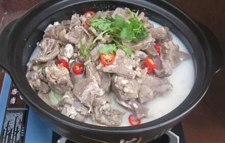 4、掺白汤,放羊肉、味精、鸡精、胡椒粉、料酒、当归,烧沸。