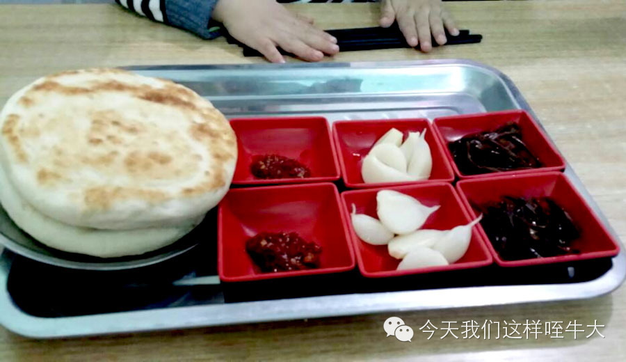 老板先端上来一个托盘,内有辣酱一小盘,糖蒜一小盘,小菜一小盘,馍一个(有的店是死面儿饼,有的店用的是发面儿饼)。