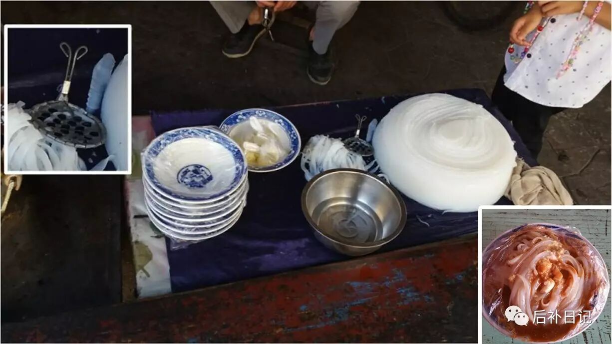 凉粉:曲沃的凉粉(又叫旋粉儿)与其他地方的凉粉制作略有不同,用面盆做好的凉粉扣到在案板上,然后用挠子(见左上小图)在凉粉块上做螺旋运动,条状凉粉便被旋出(挠出)来了。盛入碗中分别调以:黄芥末,蒜泥,米醋,酱油,盐即可。旋粉的味道酸辣醒脑,非常开胃。另外,黄芥末味道较绿芥末更加温和,爱吃芥末的人可以多放一些也无妨。