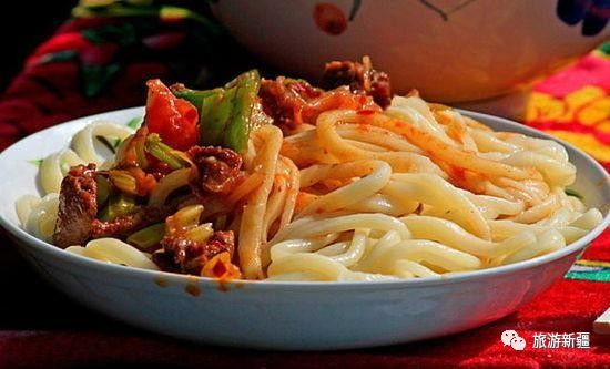 拌面的维吾尔语“浪漫”, 新疆拌面是新疆人最主要的快餐方式,类似于兰州人的牛肉面、北京人的杂酱面。但拌面的体量和材料都比上述面食高很多,一大盘子上来,往往会让上海人觉得要四个人才能吃完,当然价格也高,2011年的拌面均价是12元了。拌面馆子一般由回族、维吾尔族经营,风格略有差异。回族拌面油多,亮堂堂的,以奇台拌面最为著名。新疆拌面一般一个人足够了,如果吃不饱,可以免费加面。以前有个笑话,一群驴友去吃拌面:老板,来一份拌面,加8个面...