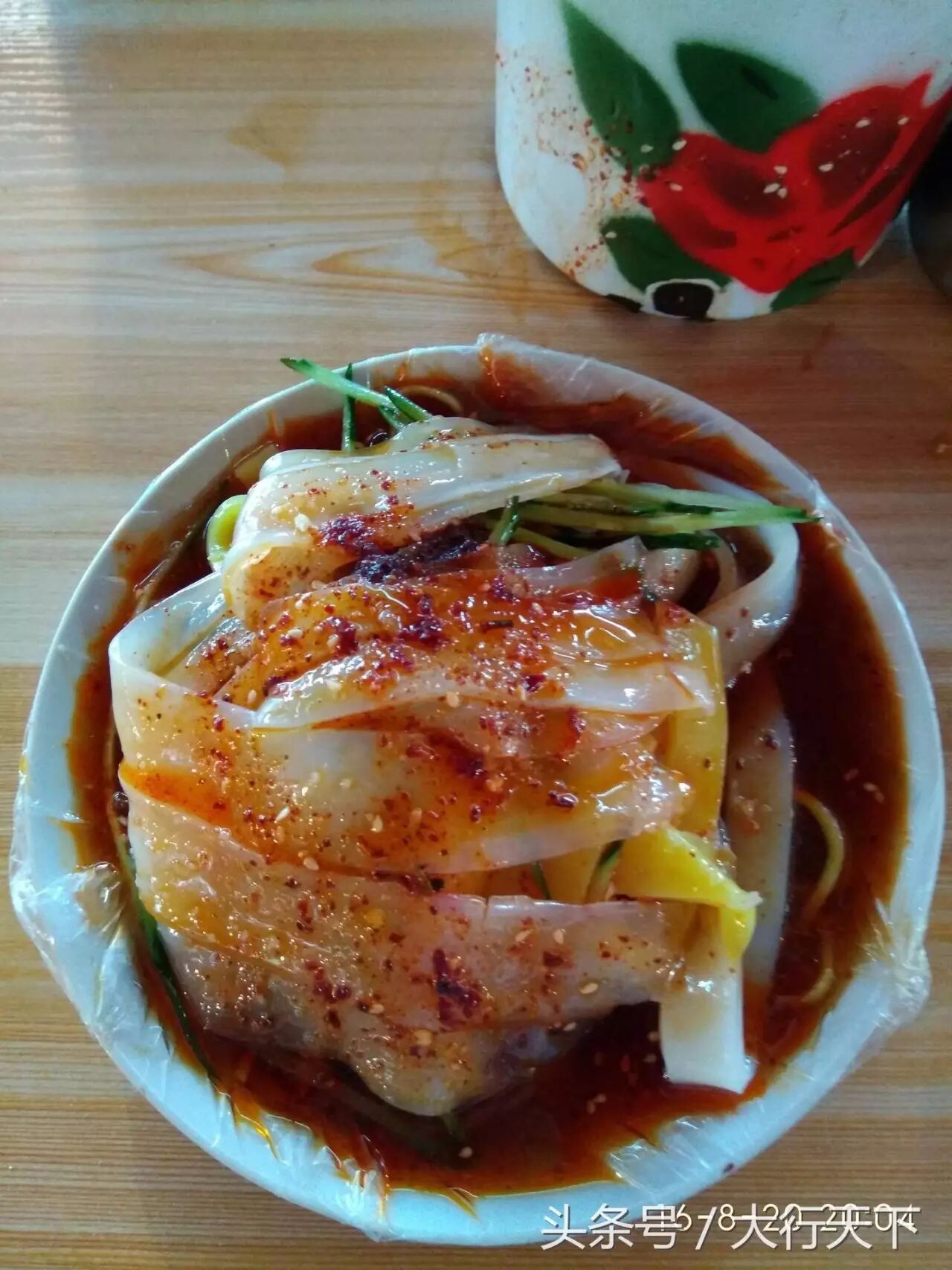 当一盘色、香、味俱全的凉皮放到你面前时,会骤觉浑身舒爽,吃到嘴里,香在心头,饥渴顿消,吃后,还舍不得放下筷子,回味许久。