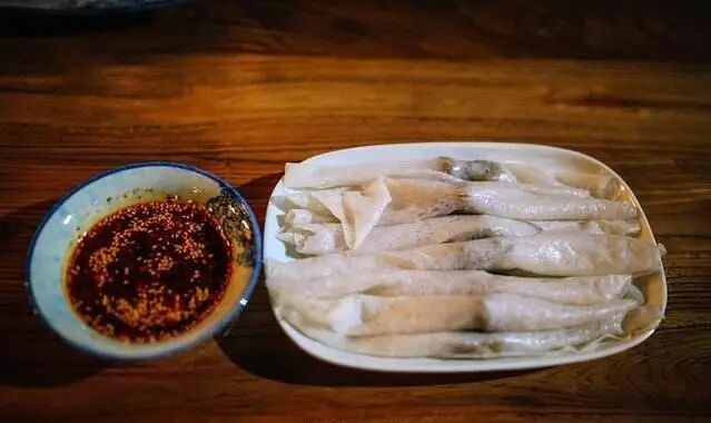 这可不是北京和天津的“煎饼馃子”,显著特点就是小!小到只有7~8公分宽、20公分长的样子。豆腐干裹在煎饼里,饼皮很Q,蘸料敲好吃!