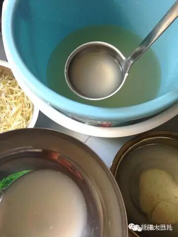 从揉面到洗面,忙碌了1个小时,你可以歇歇了,因为你洗出来的那桶白花花的面粉水,通常需要5-6个小时的静置,才会彻底分离出清水,留下上锅蒸凉皮的凉皮浆。
