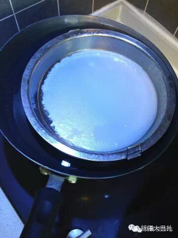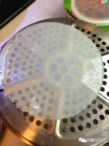 看炒菜锅里水烧开了,立即把锣锣轻柔地放在水面上,盖上锅盖开始蒸。大约3分钟就蒸好一张,期间千万不能揭开锅盖!一揭开锅盖凉皮会断裂。最好你用那种透明的锅盖,如果看到凉皮在锣锣里面鼓起了大泡,就说明好了,可以揭开盖拿出来。