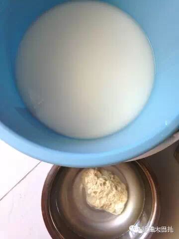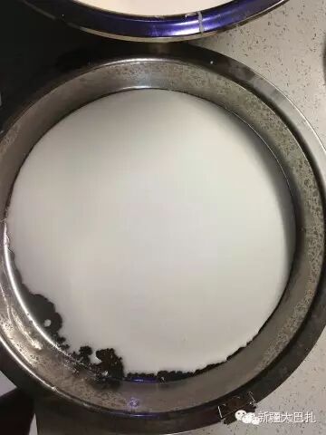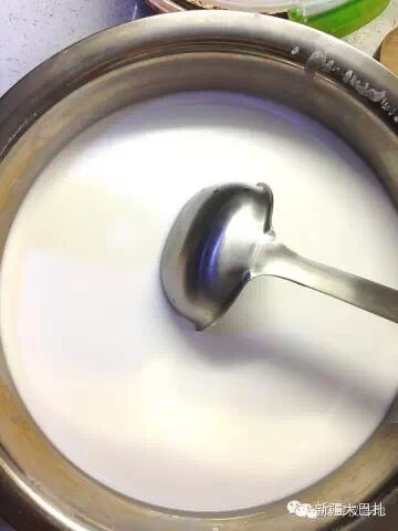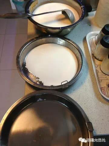 一般一桶面浆水只有最底下的1/4是蒸凉皮用的凉皮浆,上面都是无用的清水。你一定要细心地把所有凉皮浆上的清水去除干净,得到的凉皮浆越纯,最后的凉皮越筋道。注意,刚开始容器上面几乎全是清水,你可以大勺大勺地盛,越到下面,越离凉皮浆近。你要格外小心,千万不要惊动了已经澄得安安稳稳的凉皮浆,要发挥你作为贤惠人儿特有的细致及耐心,在不搅浑凉皮浆的状况下,尽可能把上面的清水全部取出。