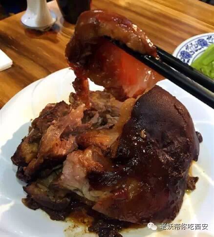 陕西第一硬菜,大荔带把肘子,到了大荔怎么能不吃呢?同州路上的大荔饭店,老板是大荔肘子的陕西省非物质文化遗产传承人,肘子蒸的香烂,酱味浓郁,肥不腻、瘦不柴,皮是最香的,用馍夹上,再抹上油泼辣子,就是忒C!他家还有老陕的功夫菜,水磨丝,猪耳切片,再切成细细的丝,沾芝麻酱醋水,下酒良品。