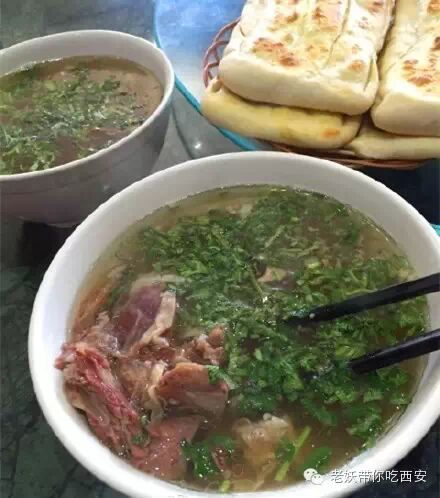 整碗就是清汤、手撕的羊肉块,无粉丝、木耳、黄花那些,饼是牛舌头饼,夹肉泡汤,泡到汤里不散,略筋,一口饼、一口肉、一口汤,汤鲜肉烂馍酥,不腥不膻,这天气吃上一碗,头上已微微出汗,很是舒坦,绝嗨!